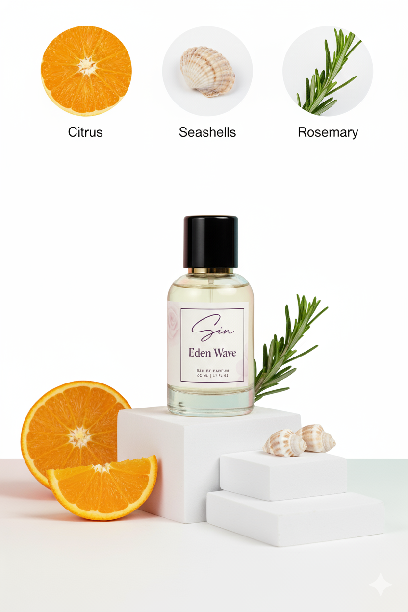 Inspired by the serenity of the sea and the beauty of morning air, Eden Wave is SIN’s ode to freedom. It drifts between citrus sparkle and floral softness, reminding you that simplicity can feel divine.